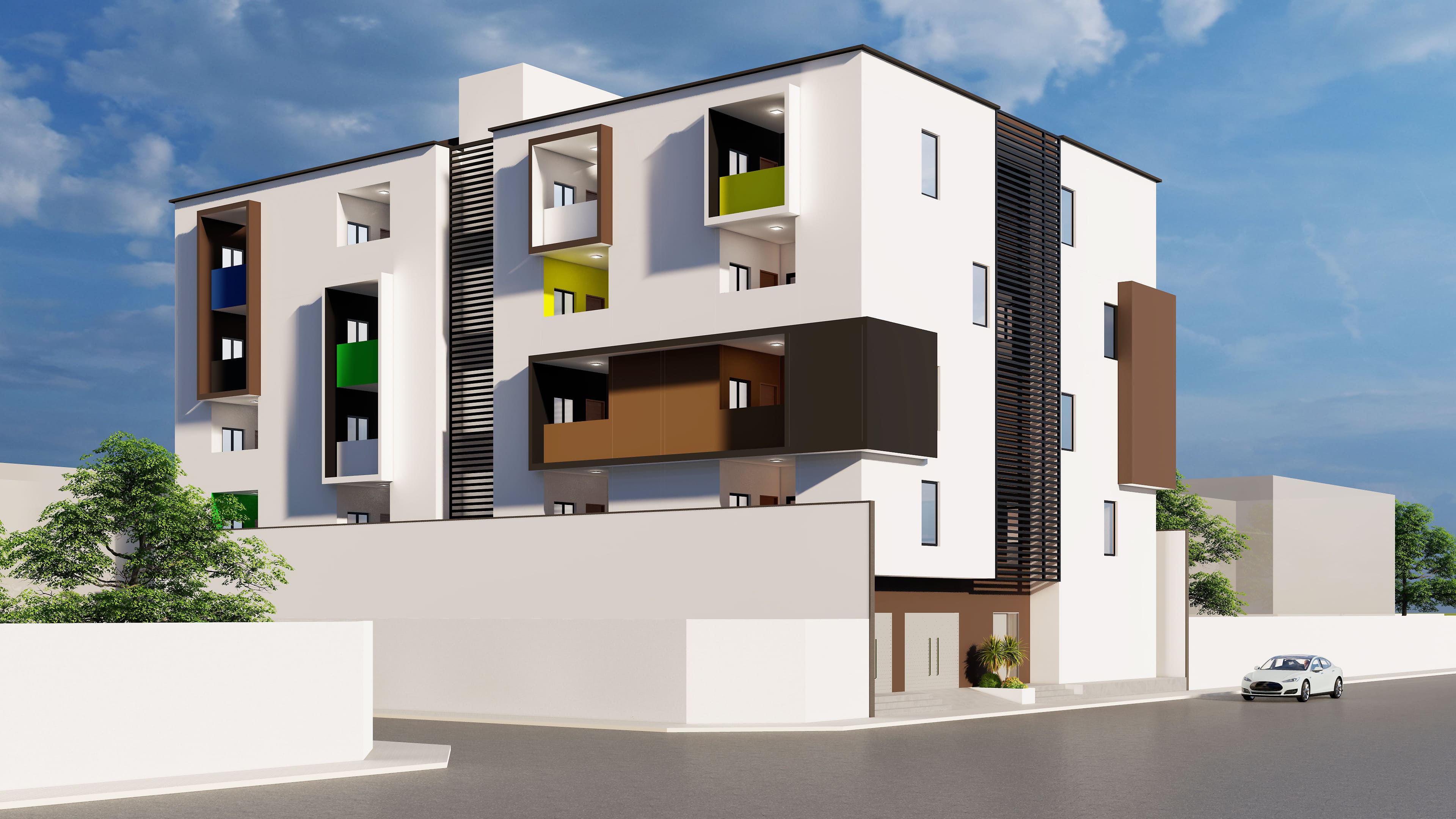 Cet immeuble de R+4 s'étend sur 600m² et est conçu pour répondre aux besoins des étudiants, offrant un cadre de vie fonctionnel et abordable. Avec 32 appartements, dont 3/4 sont des F2 et le reste des studios, ce projet vise à offrir une variété d'options pour les étudiants recherchant confort et praticité. Au rez-de-chaussée, une épicerie et une conciergerie sont disponibles pour assurer le quotidien des résidents, tandis que des locaux techniques garantissent le bon fonctionnement de l'immeuble. L'architecture est simple mais chaleureuse, avec l'utilisation de couleurs vives qui apportent dynamisme et convivialité à l'ensemble du bâtiment. Ce projet se veut un lieu de vie agréable et accessible pour les étudiants de la ville, offrant à la fois confort et commodités au cœur de Lomé